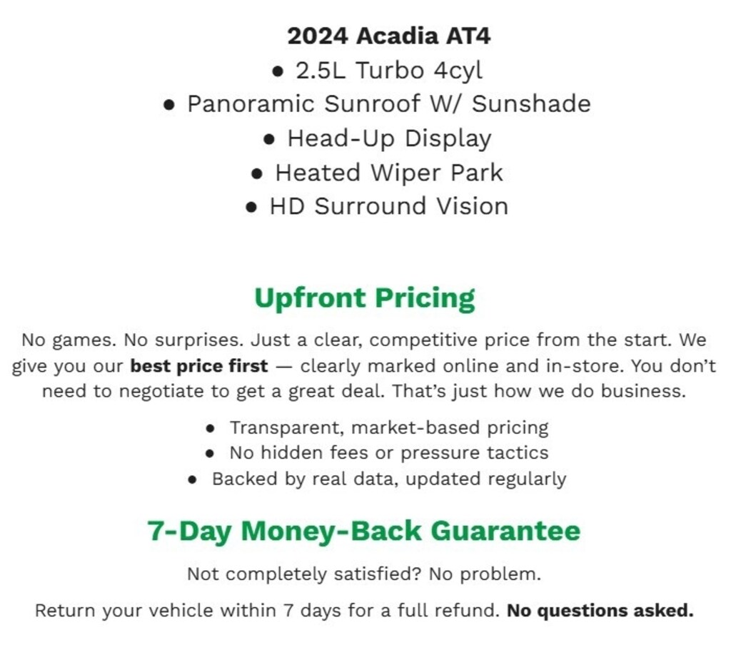 Bergstrom Premier Motorcars of the Fox Valley wants to buy your vehicle - even if you don't buy ours. Get your free and quick offer to purchase. To get our top dollar offer, call our Bergstrom Buying Team Hotline at 920-429-6222. Preferred Equipment Group 4SB, Floor Liner Package (LPO) (1st & 2nd Row All-Weather Floor Liner (LPO) and 3rd Row All-Weather Floor Liner (LPO)), Cargo Package (LPO) (Foldable Cargo Organizer (LPO), Cargo Tray w/Divider (LPO), and Cargo Net), Interior Protection Package (LPO) (1st & 2nd Row All-Weather Floor Mats), Roadside Safety Package (LPO) (First Aid Kit (LPO) and Highway Safety Kit), Luxury Package (Heated Wiper Park, 8 Diagonal Head-Up Display, Laminated Acoustic Glass, Heated Rear Outboard Seating Positions, and Heated & Ventilated Driver & Front Passenger Seats), Super Cruise Package (Rear Camera Mirror, Enhanced Automatic Parking Assist, Driver Attention Assist, and Super Cruise), Power Liftgate, Engine Block Heater, Molded Flat Splash Guards (LPO), Front License Plate Bracket, Front & Rear Splash Guards, Turn signal indicator mirrors, Power door mirrors, Bumpers: body-color, Spoiler, Bodyside moldings, Heated door mirrors, Not Equipped w/Heated Wiper Park, Integrated Cargo Liner (LPO), Deleted 3 Years of OnStar Remote Access, All-Weather Rear Cargo Mat (LPO), Leather steering wheel, Voltmeter, Garage door transmitter, Illuminated entry, Trip computer, Telescoping steering wheel, Heated steering wheel, Apple CarPlay/Android Auto, Tachometer, Driver door bin, Auto-dimming Rear-View mirror, Rear reading lights, Overhead console, Tilt steering wheel, Compass, Front reading lights, Outside temperature display, Sport steering wheel, Passenger vanity mirror, Driver vanity mirror, Air Conditioning, Automatic temperature control, Rear window defroster, Front dual zone A/C, Rear air conditioning, 8-Way Power Driver Seat Adjuster, 6-Way Power Front Passenger Seat Adjuster, Remote keyless entry, Power driver seat, Power windows, Power steering, Steering wheel mounted audio controls, Radio: 15 Premium GMC Infotainment System, SiriusXM w/360L, Bose Performance 12-Speaker System w/Sub-woofer, 12 Speakers, Radio data system, AM/FM radio: SiriusXM with 360L, Low tire pressure warning, Rear side impact airbag, 4-Wheel Disc Brakes, Emergency communication system: OnStar and GMC connected services capable, Rear anti-roll bar, Dual front impact airbags, ABS brakes, Overhead airbag, Dual front side impact airbags, Front anti-roll bar, Occupant sensing airbag, Traction control, Speed-sensing steering, Four wheel independent suspension, Collapsible Cargo Area Organizer (LPO), Passenger door bin, Panic alarm, Security system, Removable Trailer Hitch (LPO), 7-Passenger Seating (2-2-3 Seating Configuration), Driver 4-Way Power Lumbar Seat Adjuster, Front Passenger 4-Way Power Lumbar Seat Adjuster, Heated Driver & Front Passenger Seats, Cloth/CoreTec Seat Trim, Front Center Armrest, Split folding rear seat, Front Bucket Seats, 3rd row seats: split-bench, Power passenger seat, Heated front seats, Black Center Cap w/Black Logo (LPO), Bright Center Caps w/Black GMC Logo (LPO), Wheels: 18 Black (LPO), Wheels: 18 x 8 Dark Machined Aluminum, Black Wheel Locks & Lugs (LPO), Alloy wheels, Active Cruise Control, Speed control, Panoramic Power Sunroof w/Sunshade, Rear window wiper, Variably intermittent wipers, Exterior Parking Camera Rear, Electronic Stability Control, Brake assist, Auto High-beam Headlights, Fully automatic headlights, Delay-off headlights, Front fog lights, 3.49 Final Drive Axle Ratio, and Navigation System.