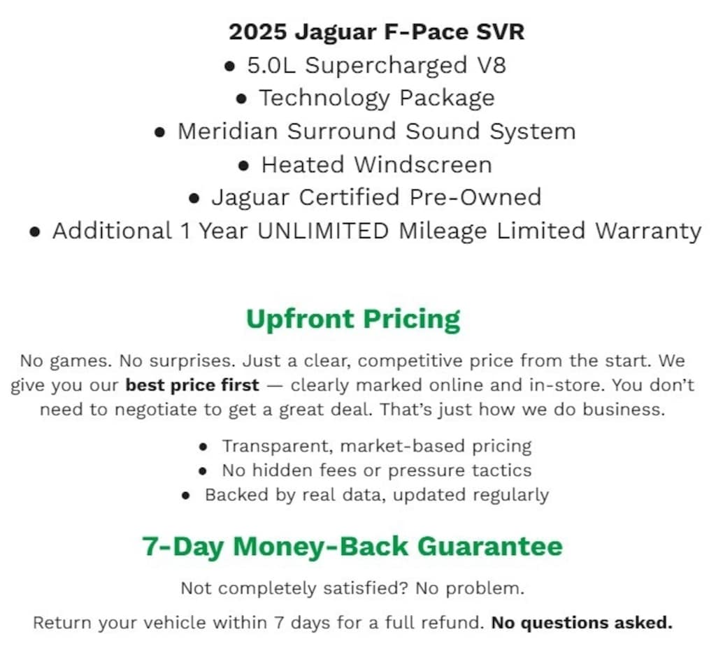 Recent Arrival! 2025 Jaguar F-PACE SVR CARFAX One-Owner. Clean CARFAX. Fuji White AWD 5.0L V8 Supercharged